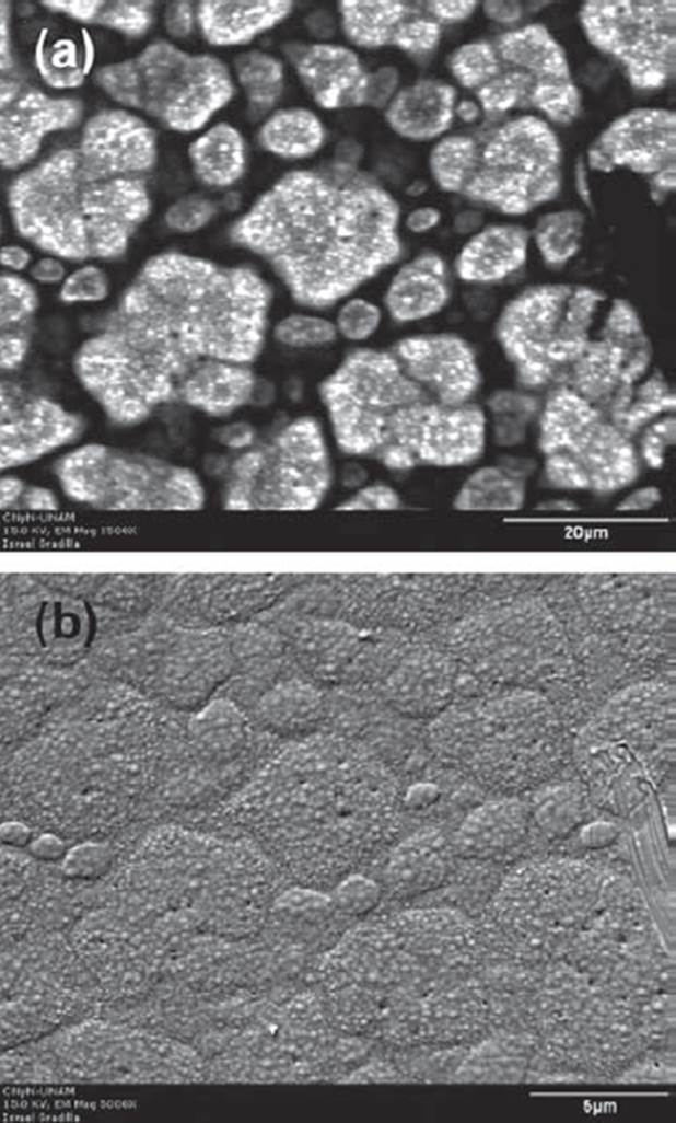 En un SEM es posible sincronizar el barrido del haz de electrones sobre una superficie con la adquisición de la señal de CL. Haciendo esto se logran asignar los valores de intensidad de luz detectada en cada punto de la superficie durante el barrido, construyendo imágenes de distribución de intensidad CL. La Figura 6(a) muestra una imagen de CL de una película semiconductora de nitruro de aluminio, indio, y galio (AlInGaN) de tan sólo 200 nm de espesor. Como se aprecia al comparar las imágenes de CL y topografía (Figura 6b) las islas que componen la superficie de la película producen una intensa señal de CL. Este efecto es atribuido a un mayor contenido de Indio (In) y a una reducción de la brecha de energía del semiconductor (Herrera et al., 2004).