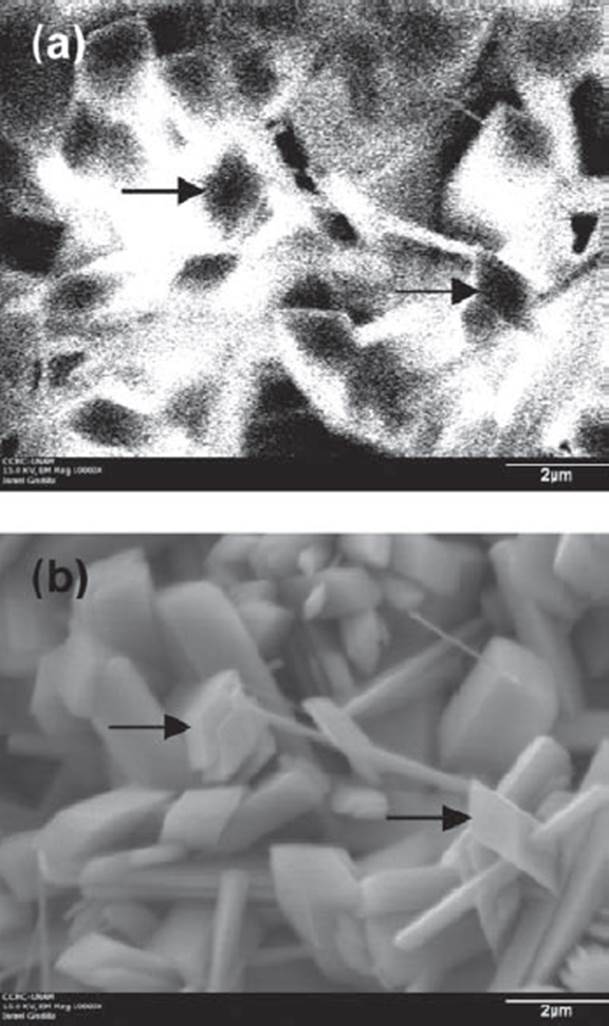 Las imágenes de CL nos permiten identificar las regiones de un material que producen poca o ninguna luminiscencia, lo cual es importante a la hora de localizar la formación de defectos cristalinos no deseados que inhiben la luminiscencia. La Figura 7 muestra micro-cristalitos de óxido de Galio (Ga2O3) en forma de prismas, con nula o muy baja intensidad CL proveniente de sus tapas, en comparación con la registrada en sus caras.