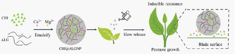 Recientemente un nanogel a base de alginato fue utilizado como portador de cloroincozadina (CHI) un compuesto biocida (Lv et al., 2021). El compuesto CHI@ALGNP incrementa su adhesión foliar en la planta de Nicotadina benthamiana, exhibiendo una liberación sostenida por 7 días. Los autores reportan que también presenta la activación de especies reactivas de oxígeno (ROS) y liberación de los cationes Ca2+ y Mg2+, estos compuestos presentan actividad antiviral contra el virus mosaico del tabaco y estimulan el crecimiento de la planta. El nanogel puede ser fácilmente aplicado como spray, implicando el desarrollo de un nuevo pesticida foliar. Como se representa esquemáticamente en la Figura 3.