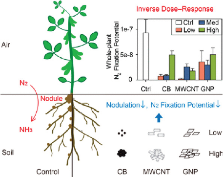 Wang et al (2017) reportan el uso de nanomateriales a base de carbono tales como, nanotubos de carbono de pared múltiple (MWCNT, por su acrónimo en inglés), nanoplaquetas de grafeno (GNP) y negro de humo (CB), en concentraciones que van desde 0.1 mg Kg-1 hasta una concentración máxima de 1000 mg Kg-1. Estos materiales carbonados pueden mediar la biomasa del suelo y la fijación del nitrógeno en función de la concentración usada, y pueden mejorar el crecimiento de la planta de soya, a bajas concentraciones. La biodisponibilidad se ve afectada por aglomeración de los materiales carbonosos afectando el crecimiento en concentraciones mayores a 1000 mg Kg-1. Cantidades bajas de MWCNT disminuyen notablemente la longitud del tallo de la soya y el área foliar. Todos los materiales de carbono aceleraron la floración de la soya, pero afectaron negativamente la nodulación y la fijación de nitrógeno. Por microscopía de trasmisión se identificó que los nanomateriales parecen acumularse dentro los nódulos, como se esquematiza en la Figura 5 .