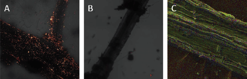 Figura 8 Imágenes de microscopía confocal-EDS para las raíces de la lechuga con: A: PA+; B: PS-, y, C: TiO2.