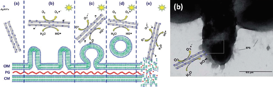 (a) Antes del tratamiento; (b) fotogeneración de ROS con radiación visible generando (c) la formación de ampollas en la bacteria, y, (d) formación de vesículas (OMS) secretadas terminando en la disrupción del mecanismo de sobrevivencia y debilitamiento de la pared de la bacteria, como se observa en la imagen SEM de la P. syringie.