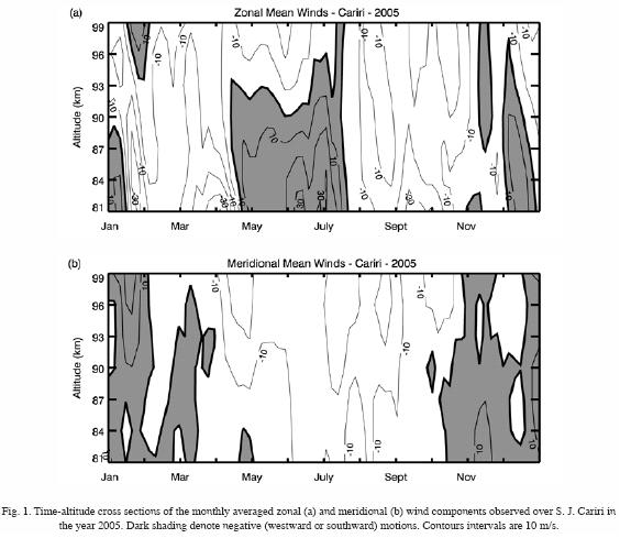 The averaged zonal and meridional winds observed in the MLT region over S. J. do Cariri during the year 2005 are represented in Figs. 1a, b. Contours intervals are 10 m/s and dark shading denote negative (westward or southward) motions. From Fig. 1a, it is possible to see that the time–altitude structure of the mean zonal wind is characterized by a semiannual oscillation (SAO) with winds that blow westward (negative values) in the whole altitude range from February to mid–April and from the end of July to October. From April to the end of July, the mean zonal wind is eastward (positive values) at altitudes below 96 km, with maximum amplitude at the beginning of June for altitudes below 87 km. For altitudes above 93 km the mean zonal wind is predominantly westward. The mean meridional wind is weak and exhibits an annual cycle with southward winds (negative values) from April to September. During the intervals from January to March and October to December the mean meridional wind is predominantly northward (positive values).