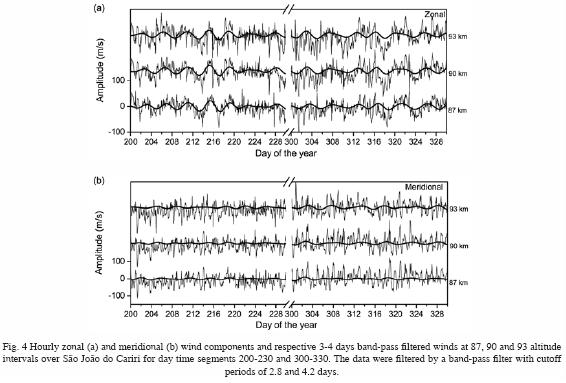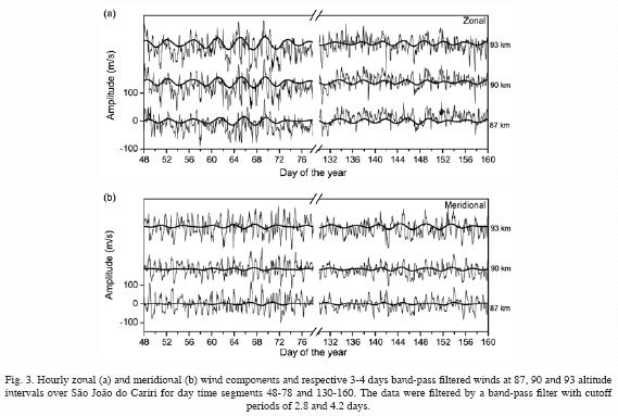 Fig. 3 displays hourly zonal and meridional wind components and 3–4–day band–pass filtered winds in three altitude intervals for time segments 48–78 (17/Feb–19/Mar) and 130–160 (9/May–8/Jun). From the graph (a), for the zonal component, it is evident that a 3–4 day wave is present and that the zonal wind is modulated by this wave, mainly during the first time segment, when the 3–4 day oscillation amplitude was more intense. As illustrated in plot (b), the 3–4 day perturbation winds are negligible in the meridional component during both time segments.