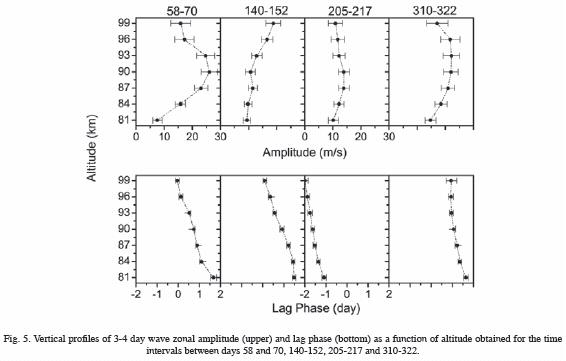 To verify the behavior of the 3–4 day oscillation in the time domain we have applied a filter, with a band pass of 2.8–4.2 days, to the time series of the zonal and meridional winds for all 7 height intervals. The amplitude and phase of the 3–4–day wave were obtained by harmonic analysis. The analysis was performed for a sliding 12–day window stepped by one day at a time.