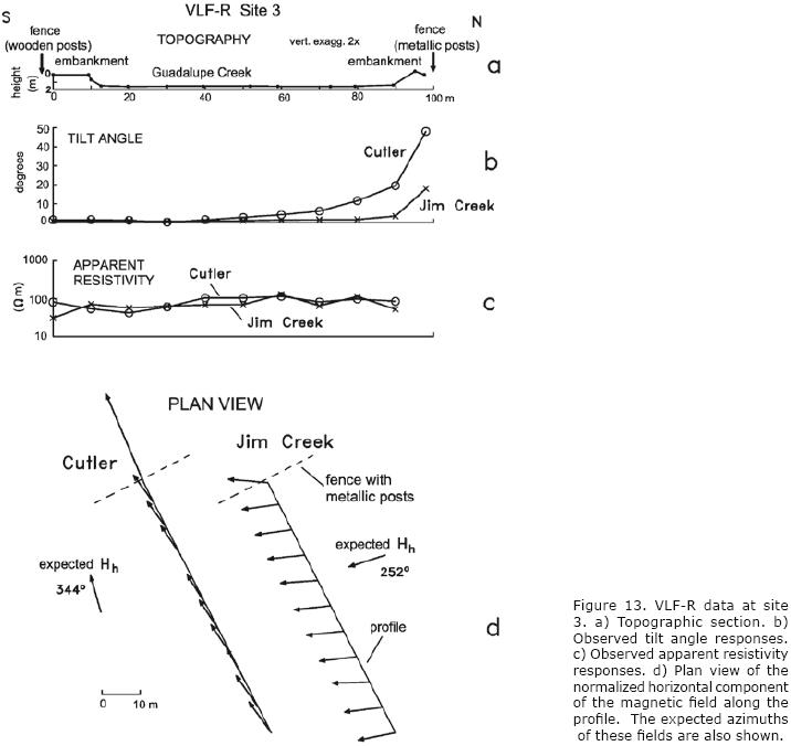 VLFR profiling. The profile is 98 m long with 10 m spacing between readings. At both ends of this line there are barbedwire fences (Figure 12a); at the southern end, the fence has wooden posts, while at the northern end the posts are metallic. The observed tilt data (Figure 13b) show increasing values as we approach the northern fence, with the Cutler response reaching values close to 50°. In contrast, there are no anomalous values close to the southern fence. There are no anomalous zones in both apparent resistivity profiles (Figure 13c). The plan view of the horizontal magnetic fields shows anomalous values close to the northern fence, especially in the response of the Cutler transmitter (Figure 13d).