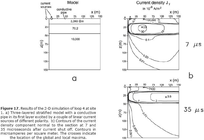 The results of a 2D numerical simulation for loop 4 are shown in Figure 17. The model is composed of a linear conductor (simulating the pipe) embedded in the first layer of a threelayered host medium (Figure 17a). A pair of linear current sources of opposite polarity, located at x=15 and 15 m, energize the subsurface. The conductor has a 25 by 25 cm cross section, its top is at a depth of 1.25 m, and has a 0.02 Ωm resistivity. The host medium is the average undisturbed TEM model depicted in Figure 7b. The distances between source and inhomogeneity simulate the field geometry of loop 4. The magnitudes of the current density perpendicular to the section are shown at 7 and 35 ps after the unit current is turned off (Figure 17b). The first time (7 μs) is approximately equal to the shortest time (6.8 μs) of the TEM 47 system. The current density contours are plotted only in the quadrant 0 < x < 150 m, 0 < z < 150m; if the inhomogeneity is excluded, the current density has odd symmetry respect to the plane x=0.