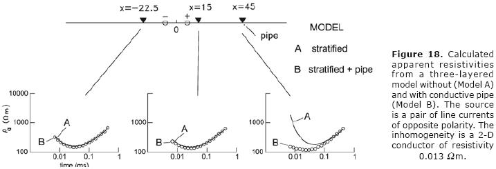 To evaluate how far the pipe affects the TEM measurements of loop 4, Figure 18 shows the apparent resistivity responses of the stratified model without pipe (model A) and with pipe (model B), at three sites located at different distances from the source (x=22.5, 15, and 45 m). The x origin is again located between the two line sources. We considered a horizontal coil of unit area as the receiver. The three responses from model A are different because of the variable transmitterreceiver separations, but they clearly show the presence of a low associated with the conductive layer. On the other hand, in the responses from model B the pipe effect is very intense at the receiver located at x=45, decreases at x=15 and is almost null at x=22.5 m. This latter receiver simulates the position of sounding 4(10) from loop 4, which is about 70 m from the pipe. These results suggest that the actual data of sounding 4(10) could be safely interpreted with a 1D model. As the electric field at the pipe impressed by a pair of line current sources is more intense than that impressed by a square loop, the 70 m separation can be considered as the upper limit of the perturbation distance, such that, for the actual square loops, this distance could be reduced to about 60 m. It is important to point out that we can not directly compare these responses with the actual data of site 1 because of the differences illustrated in Figure 14.