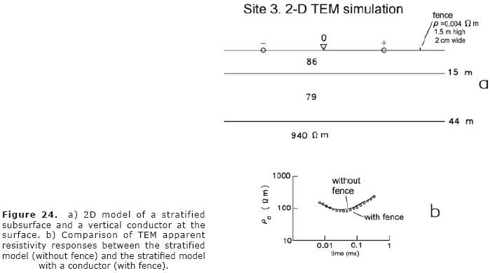 In this zone there are no obvious geologic inhomogeneities that might affect the 1D interpretation of these soundings, but the presence of the fence with metallic posts could represent an important source of noise. In the VLFR method this fence produced the strongest tilt angle anomaly of the whole study. In the 2D modeling of these data we estimated a fence resistivity of 0.004 Ω·m. To estimate the effect of the fence in the TEM data we carried out a purely 2D numerical simulation. The model (Figure 24a) consists of a threelayered earth with a highly conductive strip at the surface representing the fence. The layered model is that obtained by inverting sounding 2(1). The locations of the pair of current lines and of the receiving coil also simulate this sounding. The positive line current is 22.5 m from the fence. The comparison between the calculated responses without (solid line) and with fence (circles) is shown in Figure 24b. The conductor does affect the apparent resistivities, producing a minimum slightly more intense than the response without fence. If we invert the response with fence, the depth to the resistive substratum would be greater than the true depth. This effect explains the discrepancy between the 49 m depth estimated with the TEM soundings and the 30 m estimated with VES 208.