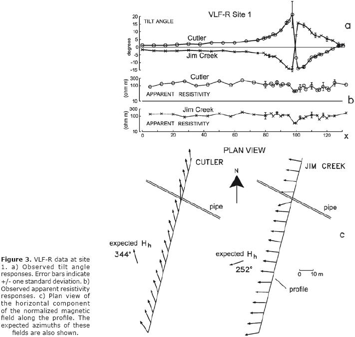 Besides the tilt and apparent resistivity, the equipment gives the intensity and direction of the horizontal component of the magnetic field, two parameters rarely analyzed in the literature that can give useful information about the induced currents; in this work we use the direction of the horizontal magnetic field in the numerical modeling of the data. The magnitudes and directions of the horizontal magnetic field along the profile are shown as arrows in Figure 3c. The magnitudes are normalized respect to the value at x=0. This normalization is necessary to accommodate the different transmitting powers and distances to the two antennae. The expected azimuths (344° and 252°), calculated with spherical trigonometry from the transmitter and receiver coordinates, are also shown (Figure 3c). For Cutler the mean observed azimuth differs 2° from the expected azimuth. For Jim Creek the difference is 18°, which could be due to inhomogeneities in the ionosphere that perturb the plane wave arrival direction. The effect of the pipe is evident in the stations close to it, where the direction and magnitude of the arrows are perturbed.