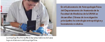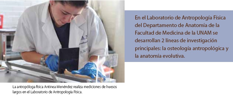 En el Laboratorio de Antropología Física del Departamento de Anatomía de la Facultad de Medicina de la UNAM se desarrollan 2 líneas de investigación principales: la de mayor tradición, que se encuentra inscrita en el ámbito de la osteología antropológica, y la que corresponde al estudio de la anatomía evolutiva.