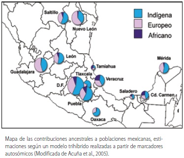 Estudios genéticos previos, han mostrado que las poblaciones de América Latina son un mosaico diverso, en el que la herencia indígena, europea y africana varía enormemente no sólo entre países sino entre regiones, localidades y grupos sociales12. En México, por ejemplo, se ha observado que la herencia indígena aumenta en el centro y en el sur del país mientras que la herencia europea es mayor en el norte y la africana es mayor en las costas centrales13,14.