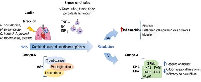 Figura 2: Respuesta inflamatoria y su resolución. Después de daño o infección por algún microorganismo se inicia una respuesta inflamatoria aguda, que activa los signos cardinales (calor, rubor, tumor, dolor o pérdida de la función) con producción de citocinas proinflamatorias (TNF-α, IL-1, IFN-γ, etc.) e infiltrado neutrofílico. En este proceso también participan prostaglandinas, leucotrienos y tromboxanos que provienen de la síntesis del ácido araquidónico para intentar eliminar a los patógenos o agentes nocivos. Esta respuesta proinflamatoria cambia hacia un fenotipo antiinflamatorio con la participación de los mediadores lipídicos pro-resolvedores de la inflamación. Estos mediadores lipídicos provienen de la síntesis del ácido eicosapentaenoico y del ácido docosahexaenoico ingeridos en la dieta como ácidos grasos omega-3 y omega-6. La resolución de la respuesta inflamatoria llega con la reparación del tejido y restauración de la homeostasis, pero si no hay un cambio de clase de los mediadores lipídicos proinflamatorios al fenotipo antiinflamatorio, puede desplazarse hacia una inflamación crónica, con repercusiones sistémicas y deletéreas para el hospedero. TNF-α = factor de necrosis tumoral α (tumor necrosis factor α); IL-1 = interleucina 1; AA = ácido araquidónico; DHA = ácido docosahexaenoico; EPA = ácido eicosapentaenoico; SPM = mediadores lipídicos pro-resolvedores de la inflamación; LXA4 = lipoxina A4; RvD1 = resolvina D1; Mar1 = maresina 1; RvD2 = resolvina D2; PDX = protectina DX; Streptococcus pneumoniae; Mycoplasma pneumoniae; Coxiella burnetii; Pneumocystis jirovecii; Mycobacterium tuberculosis.