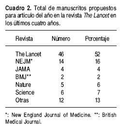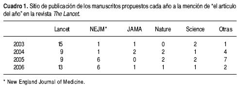 Desde el año de 2003 la revista Inglesa The Lancet se ha dado a la difícil tarea de denominar como "el artículo del año" a un trabajo original durante ese año en la literatura biomédica. El esfuerzo es loable y digno de comentarse. De acuerdo con las palabras de Richard Horton, el editor en jefe de The Lancet,1 la filosofía de este reconocimiento es la de un ejercicio intelectual entre los miembros del International Advisory Board de la mencionada revista, que en total suman 24, para identificar lo que en la opinión de ellos sea el trabajo original y de importancia en medicina que merezca esta denominación. No es un premio, porque no involucra la entrega de ningún tipo de diploma o recompensa monetaria ni existe ceremonia asociada. Se trata, dicen, de reconocer el trabajo en equipo, ya que no se premia a una persona, sino que todos los autores de la publicación definida como "el artículo del año" serán reconocidos por sus pares.