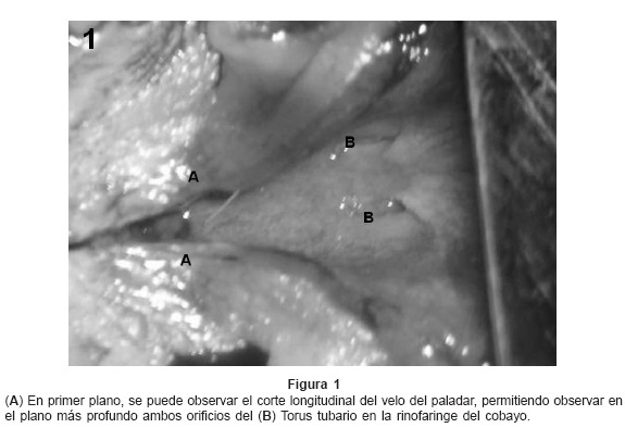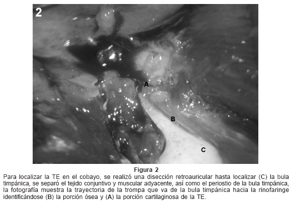 En el caso de los cobayos la porción cartilaginosa de la TE es de forma cilíndrica con una medida de 2mm de longitud y el músculo tensor del velo del paladar es el encargado de abrir y cerrar la TE. El torus tubario está en la pared lateral de la rinofaringe y su apertura es de 1mm de diámetro, la porción ósea de la trompa es de 4mm la cual desemboca en la bula timpánica en la porción cefálica de la bula con un diámetro de 1mm. La porción cartilaginosa de la TE se invagina en la porción ósea. (Figs. 1 y 2)