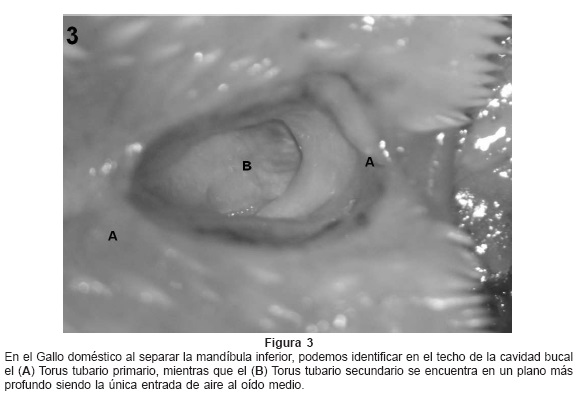 En el gallo doméstico, el torus tubario se encuentra en la porción dorsal y medial de la cavidad oral, que es una hendidura que denominamos torus primario, mide 8mm de longitud aproximadamente y tiene 3mm de profundidad, en el fondo de esta hendidura en su porción caudal se encuentra el torus que denominamos secundario, con una entrada de aire común a los oídos medios, es cartilaginoso y su dirección es dorsal interna con un diámetro de 2mm, posteriormente se bifurca y cada parte se invagina en dos entradas óseas en la base del cráneo, que continúan la dirección del conducto óseo, y este sigue la dirección hacia el oído medio, el cual es un conducto bien definido en medio de un hueso esponjoso, la porción ósea de la trompa mide 4mm de longitud tiene forma de cono presentando en el diámetro menor la entrada de la trompa cartilaginosa y aumentando su diámetro hacia el oído medio. (Figs. 3 y 4)