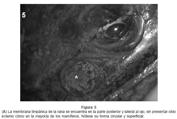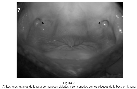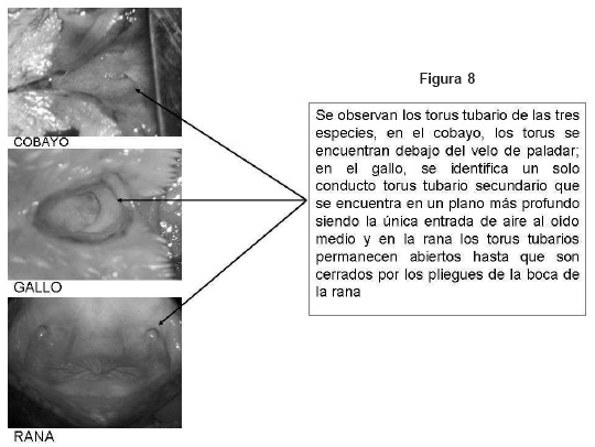 En la rana, encontramos al torus tubario en la porción lateral de la orofaringe (propiamente no existe la rinofaringe), el torus permanece abierto todo el tiempo y se cierra con lo pliegues de la cavidad oral. Es óseo en toda su porción medial y cefálica, el diámetro del torus tubario es de 3 mm. No existe la trompa cartilaginosa, la consistencia de todo el trayecto de la trompa es óseo paralelo al paladar y su longitud es de 7mm siguiendo la forma del torus tubario, en su porción dorsodistal está la membrana timpánica. La TE tiene forma de hendidura con un canal cartilaginoso que completa la porción ventral, no se pueden precisar las inserciones ya que se prolonga por atrás de la membrana timpánica hacia la región dorsal del tórax. (Figs. 5, 6, 7 y 8)