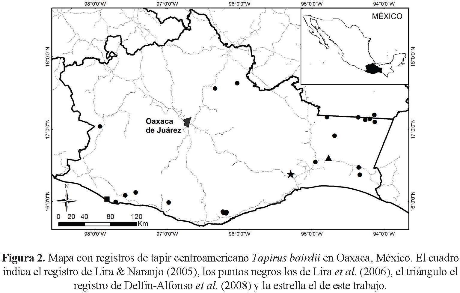 El conocimiento de la distribución histórica y actual de una especie es importante para comprender los factores que han afectado sus poblaciones en el tiempo, particular-mente de las que enfrentan problemas de conservación (Shaffer et al. 1998). En este contexto, el estudio sobre la distribución histórica y actual de tapir centroamericano (Tapirus bairdii), especie en peligro de extinción (SEMARNAT 2010; IUCN 2012), es de vital importancia en la elaboración e implementación de estrategias para su conservación. Las poblaciones del tapir centroamericano han sido severamente afectadas por la cacería y la perdida y fragmentación del hábitat (March & Naranjo 2005). En México su distribución histórica incluía los bosques tropicales húmedos y secos de las vertientes del Pacifico y Golfo en Veracruz, Guerrero, Oaxaca, Chiapas, Tabasco y la Península de Yucatán (March & Naranjo 2005; Nolasco et al. 2007). Actualmente su área de distribución ha disminuido considerablemente, existiendo poblaciones aisladas en Veracruz, Oaxaca, Chiapas, Campeche y Quintana Roo (March & Naranjo 2005; Naranjo 2009). Estudios recientes han mostrado evidencia de la distribución geográfica, histórica y actual del tapir centroamericano, reuniendo información y ampliando el conocimiento de la especie en Oaxaca y estados vecinos (Lira et al. 2006; Lira & Naranjo 2005; Delfín-Alfonso 2008). Lira et al. (2006) sugieren la existencia de poblaciones en la región de los Chimalapas, Sierra Juárez y Costa del Pacifico; en tanto que Delfín-Alfonso et al. (2008), reportan un ejemplar sacrificado en el municipio de Santo Domingo Ingenio, en la Planicie costera del Istmo de Tehuantepec.