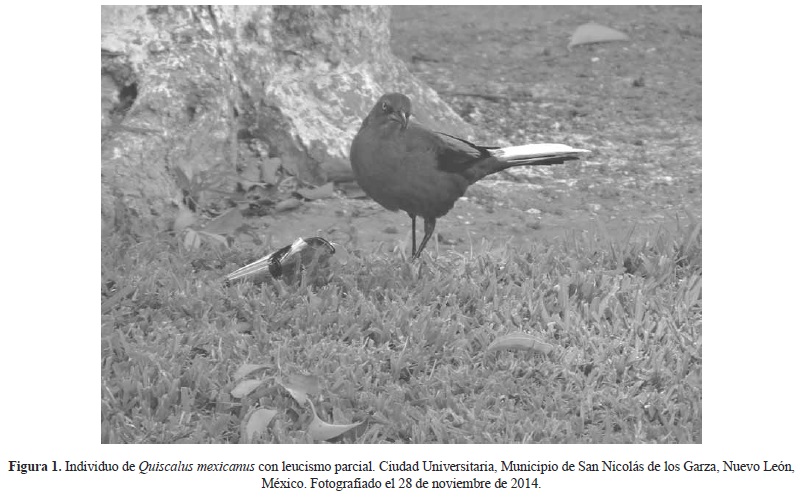 El día 28 de noviembre de 2014 en Ciudad Universitaria de San Nicolás de los Garza, Nuevo León (25°43'35.57"N 100°18'35.77'W), observamos una hembra de Quiscalus mexicanus con leucismo parcial en las rectrices superiores (Fig. 1). Se determinó que esta hembra de Q. mexicanus presentaba leucismo parcial (de acuerdo a van Grow 2012). Esto lo hemos observado en diferentes individuos en forma recurrente, desde hace aproximadamente siete años, pero solo recientemente se obtuvo una fotografía.