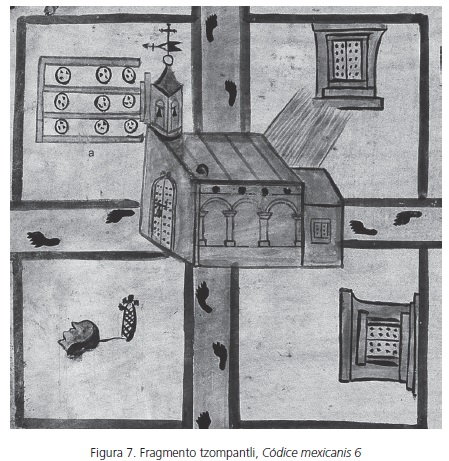 2. La representación estética y espacial. El trazado urbano del mapa se ordenó en torno a un centro bien definido del que parten cuatro caminos, que lo dividen en cuatro cuadrantes. En este espacio se ubicaron los edificios emblemáticos, conviviendo aquéllos de características coloniales, como la iglesia, junto a otros de claras resonancias prehispánicas como los teocalli o el tzompantli, una estructura cargada de fuertes connotaciones político-coercitivas que ha sido analizado por Emilie Carreón (figura 7).6