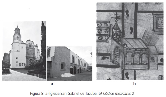 Al examinar los calcos, tanto el mexicano como el vienés, comprobé que la fachada de la iglesia estaba representada con más detalles que en los mapas. Las características arquitectónicas tenían gran parecido con la iglesia y convento de San Gabriel de Tacuba, perteneciente también a la orden franciscana y edificada en el siglo XVI (figura 8). Aunque a lo largo de sus cinco siglos de existencia ha sufrido cambios y ampliaciones, aún conservaba partes originales de la época de su fundación, como la fachada y la pequeña galería porticada lateral, tal y como aparece representado el convento-iglesia en el centro del Mapa de Popotla.
