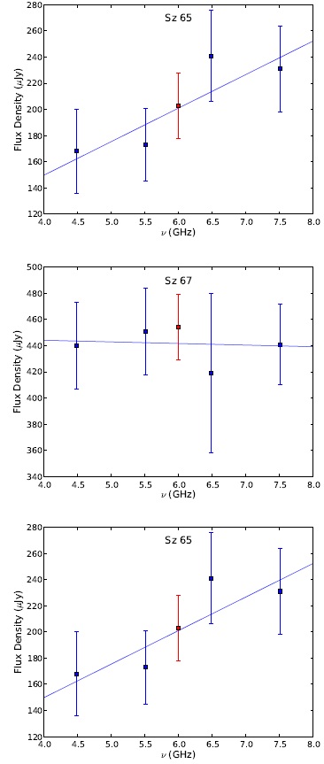As a first attempt to determine the spectral index, α (defined as Svvα) of the detected YSOs, the data sets were split and imaged in several sub-bands. For the brightest sources, the data were split in four separate sub-bands of 1 GHz each. For the weaker sources, only two sub-bands, of 2 GHz each, were imaged. The spectral index was determined from least-squares fitting to the flux densities measured in the detected sub-bands. The resulting spectral indices are given in Table 2 and the fits are shown in Figure 2. A circular polarization search was not possible since all detected YSOs in B59 are far from the observed phase center and the beam squint effect2 would stronly affect the results.