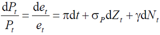 donde π es la tasa media esperada de devaluación condicionada a que no se presenten saltos, σ P es la volatilidad instantánea del nivel general de precios, y γ es el tamaño medio esperado de un salto en el tipo de cambio. Por simplicidad, se supone que el proceso Z t es independiente de N t ; de otra forma Cov(Z t , N t )=ρ ZN dt≠0 y el coeficiente de correlación ρ ZN podría ser incorporado sin dificultad en todo el análisis subsecuente con un poco más de álgebra, lo cual no es relevante para el objetivo de la presente investigación. Asimismo, en lo que sigue, π, σ P , λ y γ son constantes positivas.