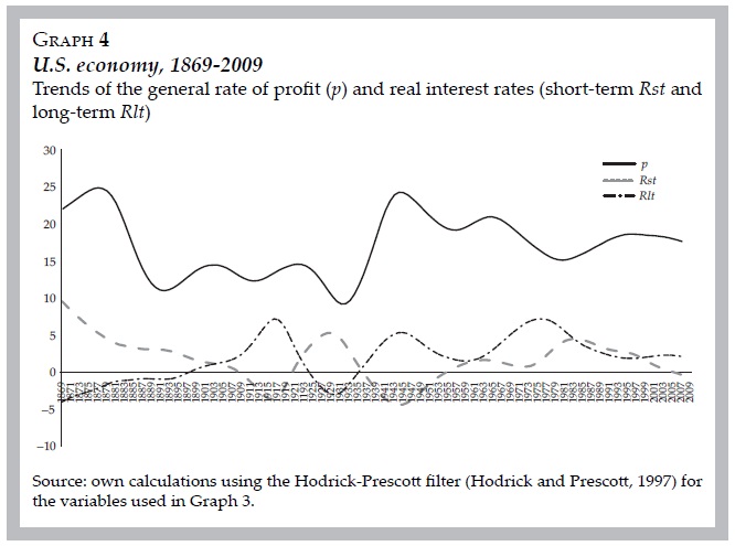2) In the U.S. economy, during the period of study (1869-2009), there seems to be evidence that the general rate of profit has fixed the upper limit to the real short-term interest rate (real Federal Funds effective rate) and to the real long-term interest rate (real Aaa corporate bond rate). Whereas the real long-term interest rate has exceeded the general rate of profit only in the years 1917, 1918 and 1920, the real short-term interest rate has exceeded it only in 1921 and in the period 19311933. Furthermore, it seems that the real long-term interest rate has undergone movements similar to those of the general rate of profit, that is to say, both variables have moved in parallel; in turn, the real short-term interest rate has experienced movements opposite to those of the general rate of profit, that is, both variables have moved in opposite directions. It is important to emphasize that the inverse relationship between the real short-term rate of interest and the general rate of profits is rather unusual since it also seems to imply an inverse relationship between the real short-term rate of interest and the real long-term rate of interest, which is something especially difficult to interpret theoretically.