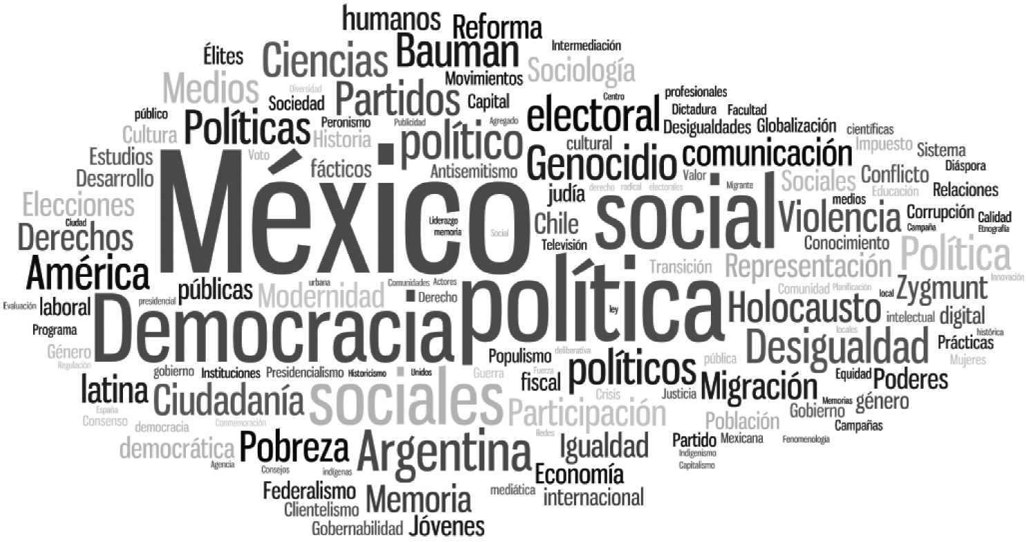Si pretendemos, en el seno de la diversidad, preguntarnos por la identidad de la Revista en función de temáticas particulares, he aquí una respuesta: México, democracia, política, políticas, partidos, pobreza y ciudadanía (figura 1). El diseño de una nube de palabras con las 978 palabras/expresiones clave de los distintos artículos de las secciones varia y dossier permite identificar la frecuencia de las distintas temáticas.