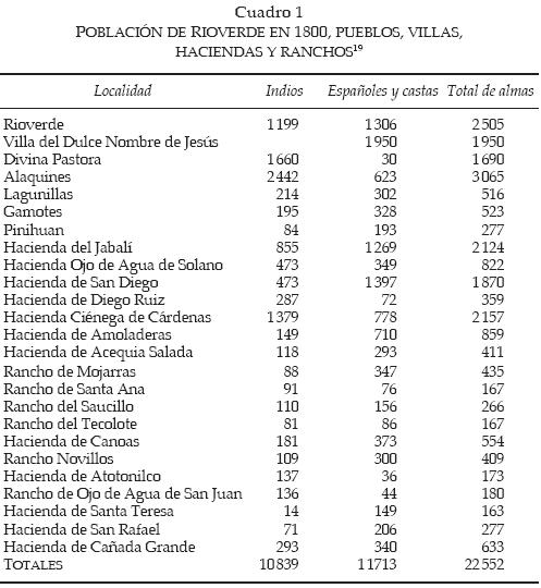 Como se puede ver en el cuadro anterior, había haciendas, como Cárdenas y El Jabalí, que contenían poblaciones casi iguales a las que habitaban en localidades tan importantes como la cabecera de partido, y que incluso superaban a la villa de españoles del Dulce Nombre de Jesús y a pueblos como Pinihuan, Gamotes y Lagunillas que tenían una escasa población, lo que nos da idea de la relevancia de las haciendas y ranchos en esta jurisdicción en cuanto al número de habitantes que llegaban a alojar.