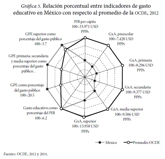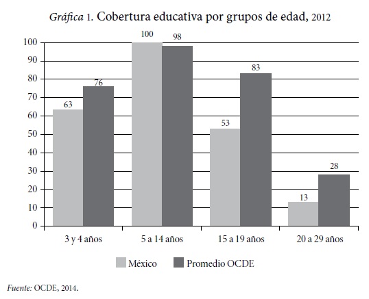 Un factor que incide en la apreciación negativa que se tiene sobre el funcionamiento del sistema educativo y sobre el uso de los recursos que se le destinan parte de considerar las diferencias que tiene nuestro país, en términos de cobertura y resultados de aprendizaje, con respecto a los países de la Organización para la Cooperación y el Desarrollo Económico (OCDE). Estos datos son muy conocidos debido a la amplia difusión que se les brinda en los medios de comunicación cada que se presenta un nuevo informe de esta organización. La información de este organismo sobre las tasas de cobertura (que expresa la relación porcentual de un grupo de edad con respecto a los que se encuentran matriculados en la escuela) muestra que en cuanto a la educación básica no hay grandes diferencias entre los países de la OCDE y nosotros, pero sí existen diferencias en preescolar y en la educación post-básica. Aquí hay que considerar que, paradójicamente, las diferencias más grandes en cobertura se presentan en la educación media superior y superior, donde los costos por estudiante son los más elevados. Por su parte, en términos del aprendizaje, los resultados del Programa para la Evaluación Internacional de Alumnos (PISA), que es una prueba que se aplica a los estudiantes de 15 años, reiteradamente nos ubica en las últimas posiciones.