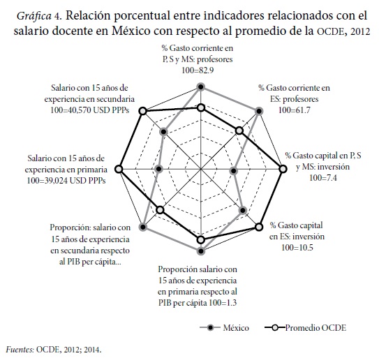En el afán de buscar culpables, algunas veces los debates se han enfocado en el peso relativo que representan los salarios de los docentes con respecto al gasto educativo total, indicador donde México usualmente queda muy por arriba del promedio de la OCDE, dado que mientras que en nuestro país esta relación se establece en 83 por ciento, en los países de la OCDE representa 63 por ciento. Esta situación se considera desfavorable debido a que deja muy pocos recursos disponibles para destinar a la inversión en el mejoramiento de las escuelas (gasto de capital), el cual, en consecuencia, se encuentra en nuestro país por debajo del promedio que representa este gasto en los países de la OCDE (2.9 contra 7.4 por ciento en primaria, y 7.6 contra 10.5 por ciento en secundaria, respectivamente). Asimismo, usualmente se señala que los salarios de los docentes en nuestro país son los que proporcionalmente se encuentran más altos en comparación con el PIB per cápita de los países respectivos, lo cual en cierta forma también es cierto.