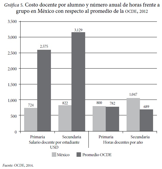 El que los docentes mexicanos atiendan a un mayor número de alumnos provoca que el salario docente por alumno sea todavía más bajo en contraste con los países de la OCDE. En México, el costo del salario docente por alumno representa sólo 28 por ciento del promedio existente en la OCDE en educación primaria, y 26 por ciento en el caso de la secundaria. Por su parte, en relación con el número de horas frente a grupo, el tiempo que destinan los docentes mexicanos es mucho mayor al de sus colegas de la OCDE, lo cual les deja menos tiempo disponible para dedicar a otras tareas relacionadas con su actividad profesional (Gráfica 5).
