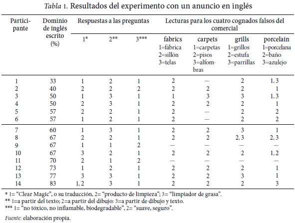 Los hallazgos del experimento 1 sugieren que el reconocimiento del "patrón cultural" registrado o inscrito en el tipo de texto a leer puede servir como guía para comprender lo que se está leyendo. Es decir, pareciera que hay un "guion preestablecido" en donde localizar y utilizar la información del anuncio con la que pueden contestar las preguntas acerca del producto anunciado y sus cualidades. Sin embargo, los datos sugieren que los lectores van ajustando sus respuestas para decir cosas "con sentido", y que sus respuestas coherentes son independientes de su experiencia previa con el código lingüístico o del reconocimiento de los elementos estructurales del texto. Es decir, los lectores acuden a los dibujos del anuncio pero tienen un comportamiento diferencial en cada uno de los cognados falsos que los acompañan: mientras nadie dice "grillos" ante la palabra "grills", la mayoría dice "porcelana" ante la palabra "porcelain".
