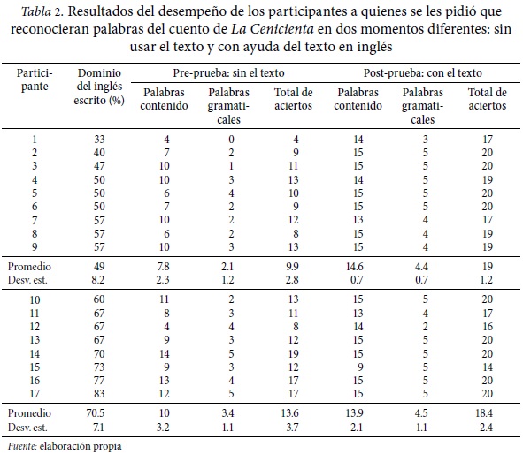 Se dividió a los 17 participantes en dos grupos (de menor y mayor dominio de inglés), a través de la clasificación con el análisis de conglomerados de dos medias. El grupo de menor dominio de inglés estuvo conformado por nueve participantes con un dominio promedio de 49 por ciento, mientras que el grupo de mayor dominio se conformó con ocho participantes con un promedio de 70.5 por ciento. De las transcripciones, podemos señalar que sólo tres participantes no reconocieron la historia al final de la pre-prueba. El participante 1 dijo que no podía aventurarse a adivinar de qué trataba el texto dado que no había podido reconocer muchas palabras. El participante 11 dijo que se trataba de una historia sobre unas hermanas que querían ir a una fiesta y convencen a la madre y a la abuela de que les ayuden. El participante 15 escribió que "Cinderella" era el nombre de un grupo de rock y que el texto habla sobre un joven que va a ir a un concierto con sus hermanas. No se refutaron estas hipótesis equivocadas para ver si, con el texto, los participantes lograban ajustar sus respuestas al cuento de la Cenicienta. Sin embargo, sólo el participante 1 reconoció el cuento. Los participantes 11 y 15 mantuvieron sus hipótesis y, aunque mejoraron su desempeño en la post-prueba, son los resultados más bajos del grupo.
