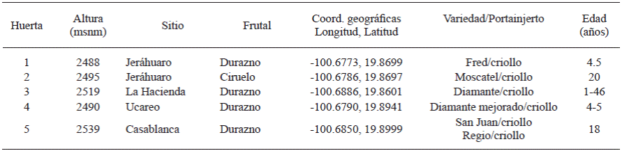 The largest peach (Prunus persica) and plum (Prunus domestica) producing area in Michoacan is located at Zinapecuaro county (19° 52’ northern latitude, 100° 50’ western longitude and 2400 to 2700 masl) in the northwestern area of the state. The topography includes the Trans-Mexican Volcanic Belt, with temperate climate and summer rains. The average annual rainfall is 622 mm and temperatures range between 3 and 34 °C (Villaseñor, 2005). The peach and plum producing area has expanded to areas of mixed pine-oak and fir-oak forests; the peach production area planted on 1256 ha represents 30 % of the state’s total area, and is concentrated in five locations: Ucareo, Jerahuaro, Huajumbaro, San Joaquin and La Galera, where 6,950 tons valued at $ 41.7 million pesos were harvested in 2015 (SAGARPA, 2015). The area planted to plum was 2827 ha in 2014, which produced 13,316 tons valued at $ 47.1 million pesos (SAGARPA, 2014).