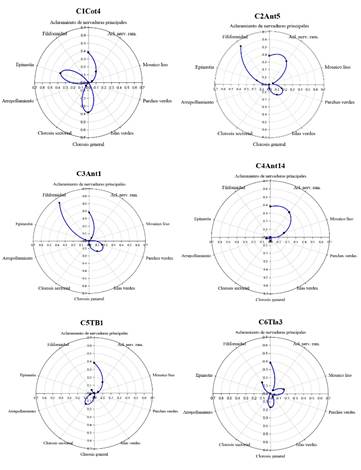 The collections C1Cot4, C2Ant5, C3Ant1 and C6Tla3 show curves that tend to concentrate in the upper left-hand side of the graphic, where the typical symptoms of foliar area deformation are plotted. Also, an association of symptoms was observed in these collections. As suggested by Rodríguez et al. (2014), there was also a relation between the severity of symptoms and the temperature, with less severe symptoms at temperatures higher than 35 °C. In the 2019 spring-summer cycle (Figure 4), “streaks” were observed in collections C1Cot4 and C5TB1, a symptom that was not observed during the cool temperature season (23 °C, fall-winter).