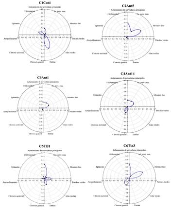 Rodríguez et al. (2014) observed clearing of leaf veins, mosaic, blisters, and foliar deformation symptoms at 45 dai. In the present study, smooth mosaic, green isles, three types of leaf deformation, and two types of clearing of leaf veins also were characterized (Figure 2). Additionally, a differentiation of symptomatology was made between each plant inoculated in the greenhouse and the plants collected in the field (Table 3). Representing the symptoms in radial graphics (Figures 3 and 4) made it possible to characterize each collection in a differential way and observe the different levels of severity of each symptom. Figure 3 shows the symptoms that appear in fall-winter; where collections C4Ant14 (36% severity in the clearing of the main and ramified nerves) and C5TB1 (36% severity in clearing of the main nerves) can be differentiated, even when the length of the curves is concentrated in the upper right-hand side, where moderate symptoms that cause less damage to the plant are found.