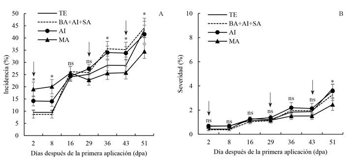 Figure 1. Progress of rust caused by Hemileia vastatrix in young coffee plants treated with biofungicides in the field, in Huehuetla, Puebla. A) Incidence, B) Total severity. Total incidence and severity were statistically compared by using the transformed values (* = p≤0.05; ns=not significant). The figure shows the non-transformed values. The arrow indicates the time when the fungicide was applied. TE=Control, AI= Azadirachta indica, MA=Melaleuca alternifolia and BA+AI+SA= Bacillus subtilis + A. indica + Syzygium aromaticum. The bars represent the standard error of the mean of each evaluation.