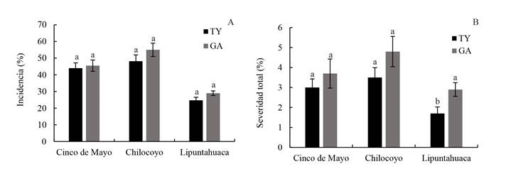 Figure 2. Behavior of coffee rust in young plants of two varieties evaluated per location in the field in Huehuetla, Puebla. A) Incidence, B) Severity. The incidence and severity were statistically compared using transformed values. The bars show non transformed values. TY=Typica, GA=Garnica. Bars with the same letter in each locality are statistically the same (Duncan, p≤0.05). The bars represent the standard error of the mean at each evaluation.