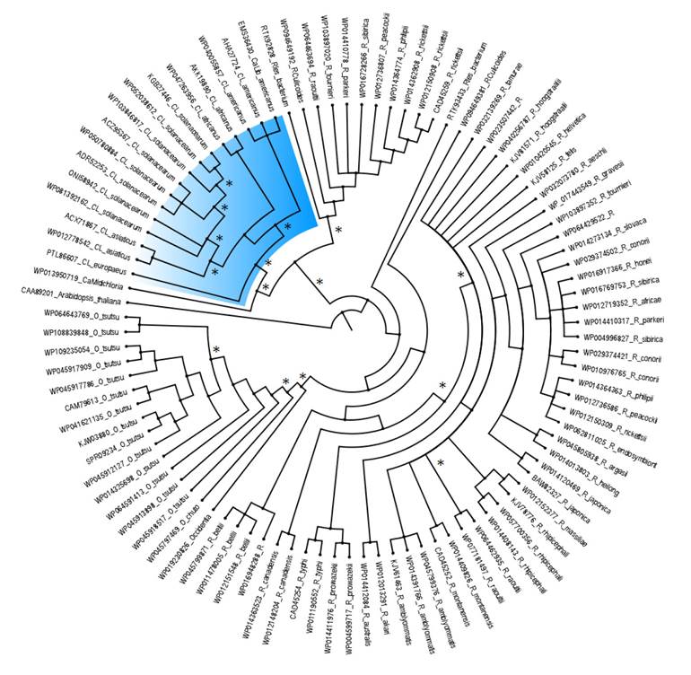 Figure 1 Phylogenetic analysis of the ATP/ADP translocase enzyme. It shows a consensus tree of eight equally parsimonious trees (L=2502). The Ca. Liberibacter clade is highlighted in blue. The nodes with an asterisk show 100% support using Bootstrap (1000 copies). The name of each tree terminal is made up of the access number to the Genbank followed by the initial of the genus and the species. Abbreviations of the genera: CL or CaLib= Candidatus Liberibacter, R=Ricketssia, O=Orientia.