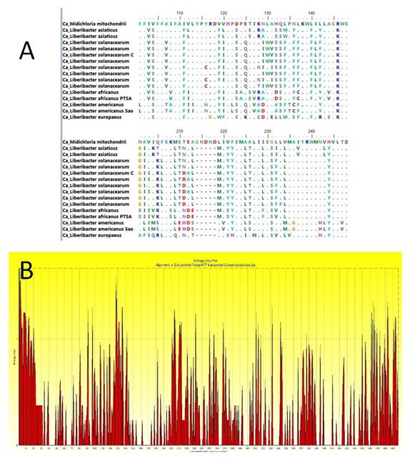 Figure 2 A) Fragment of the alignment of amino acid sequences of the ATP/ADP translocase enzyme. Amino acidic variability of each Ca. Liberibacter species compared to the sequence of Ca. Midichloria mitocondrii. B) Entropy of the positions of each amino acid in the sequence of the Ca. Liberibacter ATP/ADP translocase enzyme. Axis X= Position of the amino acid, axis Y= Entropy of each position.