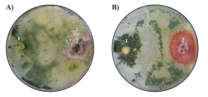 Figure 2 A) Trichoderma harzianum (1) surrounding F. oxysporum (2) expressing competition for space and nutrients in a PDA medium; (B) T. asperellum (1) surrounding F. oxysporum (2) expressing competition for space.