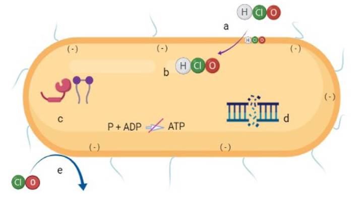 Figura 1 Esquema del mecanismo de acción del ácido hipocloroso (HClO) en células bacterianas. HClO penetra la célula bacteriana debido a su carga neutra (a), afectando los componentes de la membrana (b), como transportadores, proteínas y ATPasa; degrada lípidos y proteínas (c), e interrumpe la síntesis del ADN (d). También puede ocurrir oxidación bacteriana por contacto con el ion hipoclorito (ClO)- (e).
