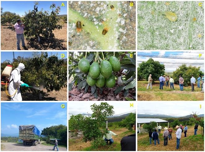 Figura 1 El manejo operativo de las principales plagas del aguacate (Persea americana) resultó afectado durante la pandemia COVID-19. Se ejemplifica con el ácaro plaga Olygonychus punicae. El manejo racional se basa en monitorear (A) el nivel poblacional del ácaro (B) y de sus agentes de control natural como el ácaro depredador Amblyseius swirskii (C); con estos criterios se aplican productos bioracionales (D). Con buen manejo se logra reducir daños y obtener frutos sanos e inocuos (E). La capacitación a productores no se realizó con la frecuencia e interacción requerida por la sana distancia (F, H, I). Se presentaron retrasos en cosecha por falta de mano de obra y limitación del transporte (G).