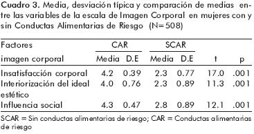 A comparative analysis using Student's ttest was conducted among students who had high and low scores in BCCAR (Brief Questionnaire to measure Risky Eating Behaviors), yielding significant differences in their scores on all three factors of the scale. This indicates that women with disordered eating show significantly higher degrees of body dissatisfaction, internalization of the aesthetic ideal of thinness and social influence than women without disorder.