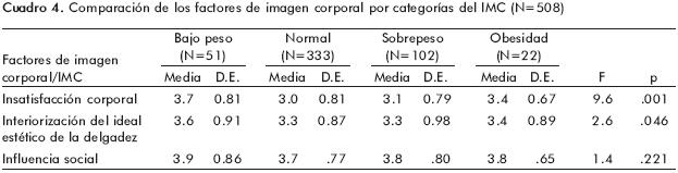 En los resultados respecto a la comparación de insatisfacción corporal y el IMC se observó que los grupos con mayor insatisfacción con la imagen corporal son las mujeres con bajo peso, seguidas de las que sufren obesidad, mostrando consonancia con CasillasEstrella et al.38 quienes observaron que no sólo los individuos obesos muestran insatisfacción de la imagen corporal. Diversos estudios sugieren que los individuos con extrema delgadez también presentan un alto grado de insatisfacción con la imagen corporal,38,39 contrastando así con los resultados encontrados por Mirza et al.40 quienes encontraron que las personas con sobrepeso y obesidad presentan mayor grado de insatisfacción corporal. En cuanto a la interiorización del ideal estético de delgadez e IMC se encontró, de modo semejante a la insatisfacción corporal, que el grupo de mujeres con mayor grado de interiorización del ideal estético de delgadez fueron las de peso bajo. Esto coincide con lo que refieren Unikel et al.41 respecto a que la promesa de alcanzar la delgadez, y la gran promoción que se hace para esto, invitan a someterse a dietas aun a las personas que no tienen sobrepeso, lo cual pone de manifiesto los niveles altos de interiorización del ideal estético de delgadez y la insatisfacción corporal de este grupo de mujeres. Tanto el peso corporal como el aspecto físico es importante para que se sientan bien y puedan conseguir ropa, sintiéndose en control cuando están delgadas.