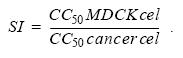 Para determinar la especificidad de la actividad citotóxica en las líneas célulares tumorales fue necesario obtener información sobre su citotoxidad en células normales. Por lo tanto, los extractos fueron probados contra una línea de MDCK. El índice de selectividad (SI) fue calculado usando la siguiente ecuación: