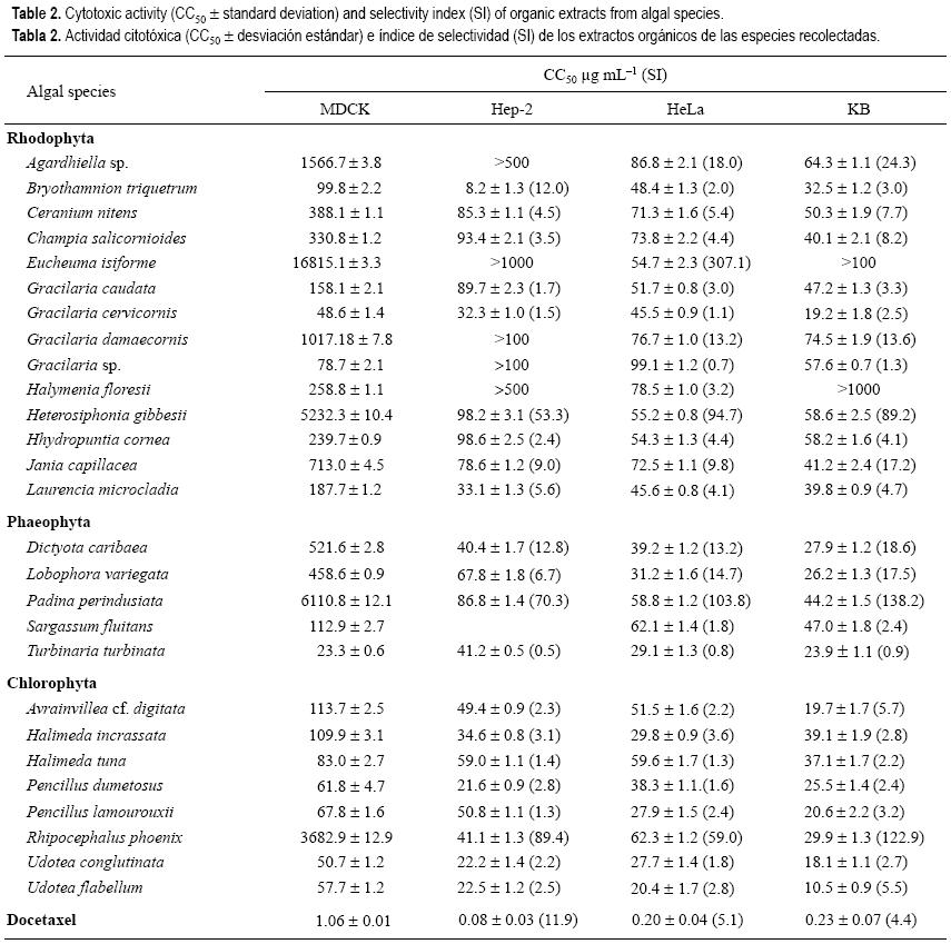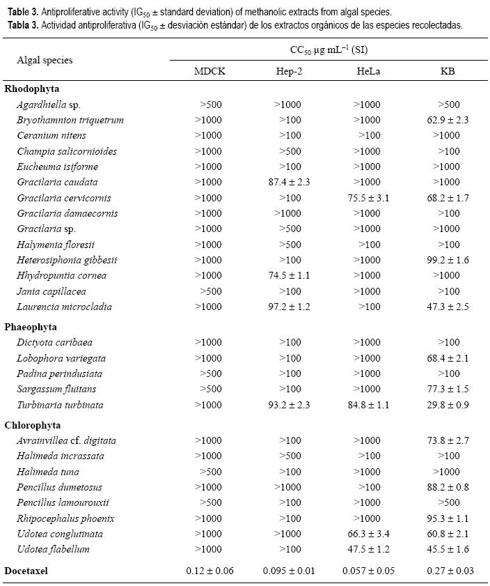 Dos de las catorce especies de Rhodophyta probadas (Bryothamnion triquetrum y Gracilaria cervicornis) resultaron citotóxicas contra las células de cáncer (tabla 2). Bryothamnion triquetrum mostró una actividad citotóxica alta y selectiva contra las células Hep2 (CC50 = 8.29 µg mL1 y SI = 12.04), así como una actividad media contra las células KB y HeLa (CC50= 32.57 y 48.45 µg mL1, respectivamente). Sin embargo, el extracto mostró una actividad antiproliferativa baja en las células KB (IG50 62.98 µg mL1) (tabla 3).