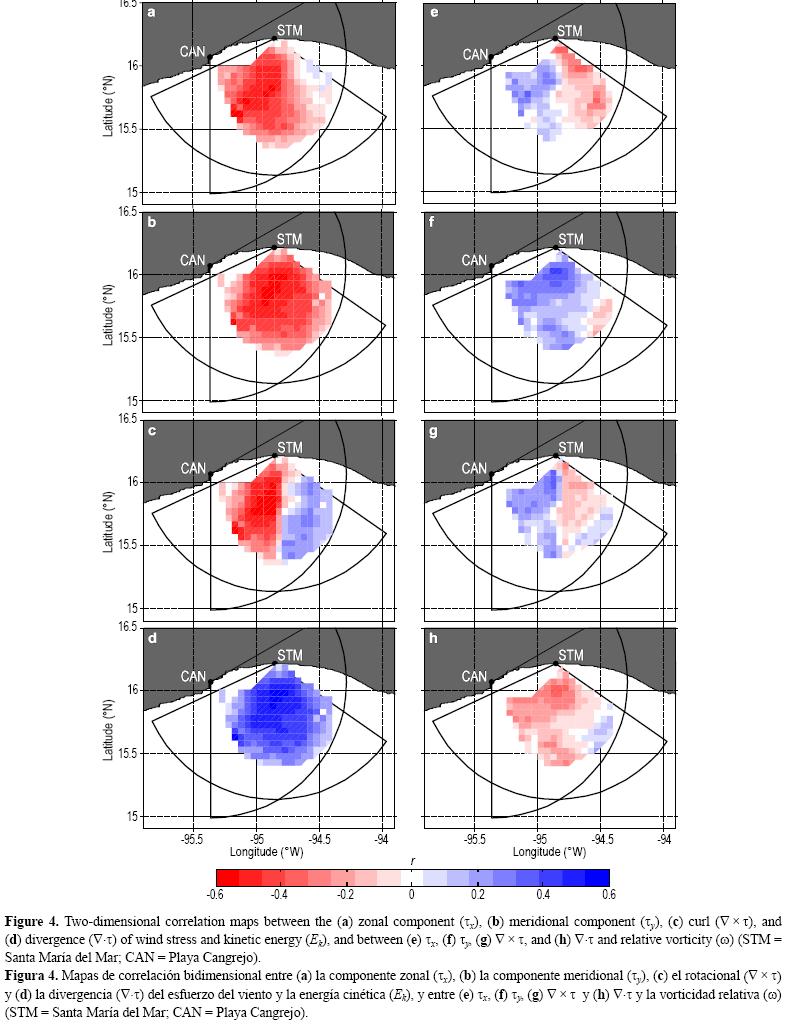 Para evaluar el efecto del esfuerzo del viento sobre la dinámica de la circulación costera en el GT, se calcularon, mediante diferencias finitas e interpolación, el rotacional y la divergencia del esfuerzo del viento para cada punto de la malla donde se tenían las mediciones de los sistemas RAF. Asimismo, con las velocidades de la corriente superficial, se calcularon la energía cinética (Ek) y la vorticidad relativa (ω) en los nodos de la malla del área de cobertura de los sistemas RAF. Para cada nodo de la malla en la figura 2a, se calculó el coeficiente de correlación entre las series de tiempo de la componente zonal (τx), la componente meridional (τy), el rotacional (∇ x τ) y la divergencia (∇ · τ) del esfuerzo del viento y las series de tiempo de Ek (fig. 4ad) y de ω (fig. 4eh).